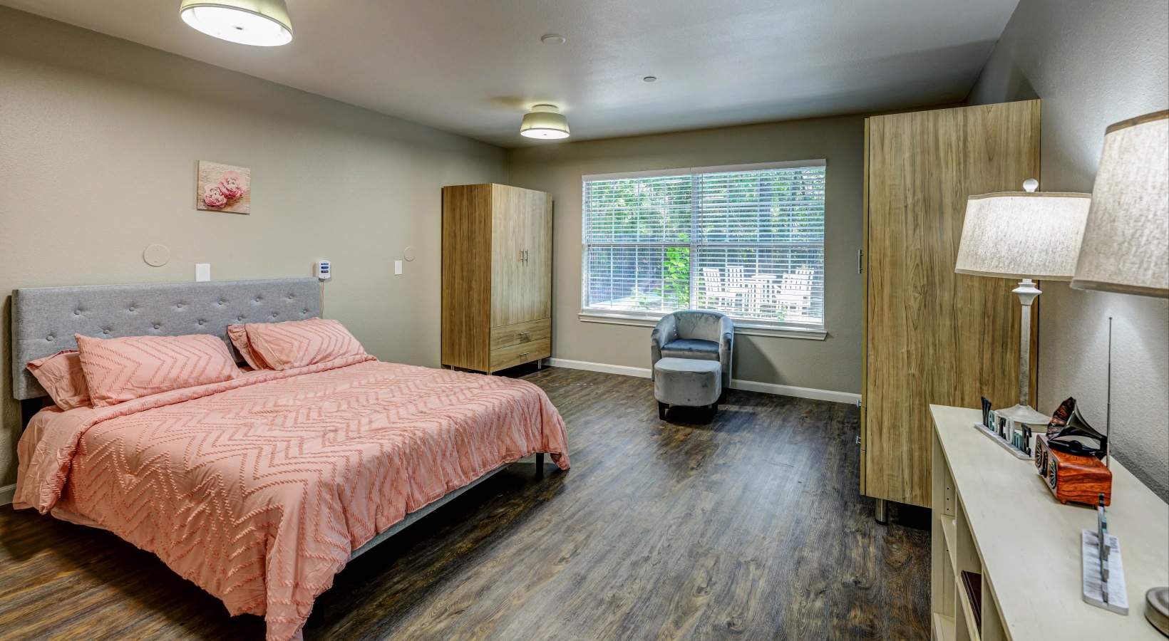 • pink bedspread in a modern room
